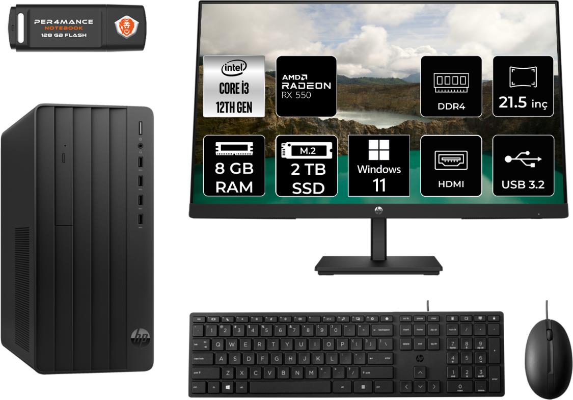 Hp Pro Tower 290 G9 Intel Core I3 12100 8gb 2tb RX550/4GB 21.5'' Fhd Monitör W11P 6D3A1EA Masaüstü Bilgisayar & Per4 USB Bellek 6D3A1EAMNT1404 (8880372979147)