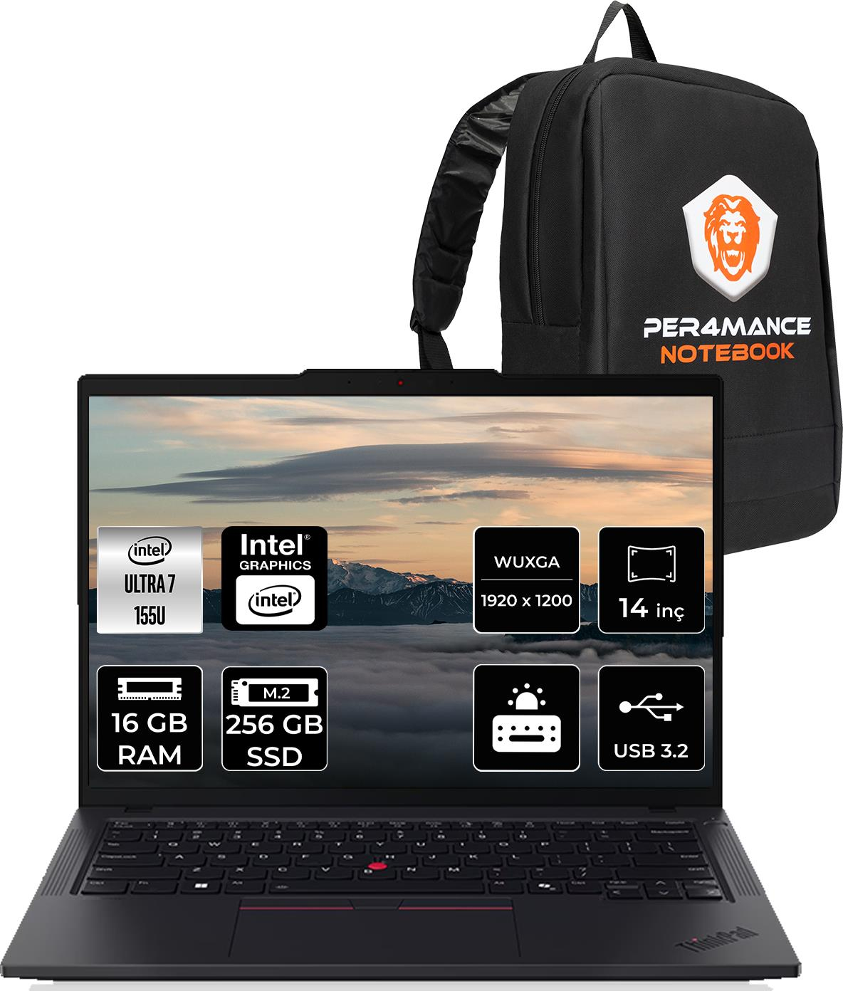 Lenovo Thinkpad T14 Gen 5 Intel Core Ultra 7 155U 16GB 256GB SSD 14'' Fhd+ Fdos Taşınabilir Bilgisayar & Per4 Çanta 21ML008MTXP306 (1956354851785)